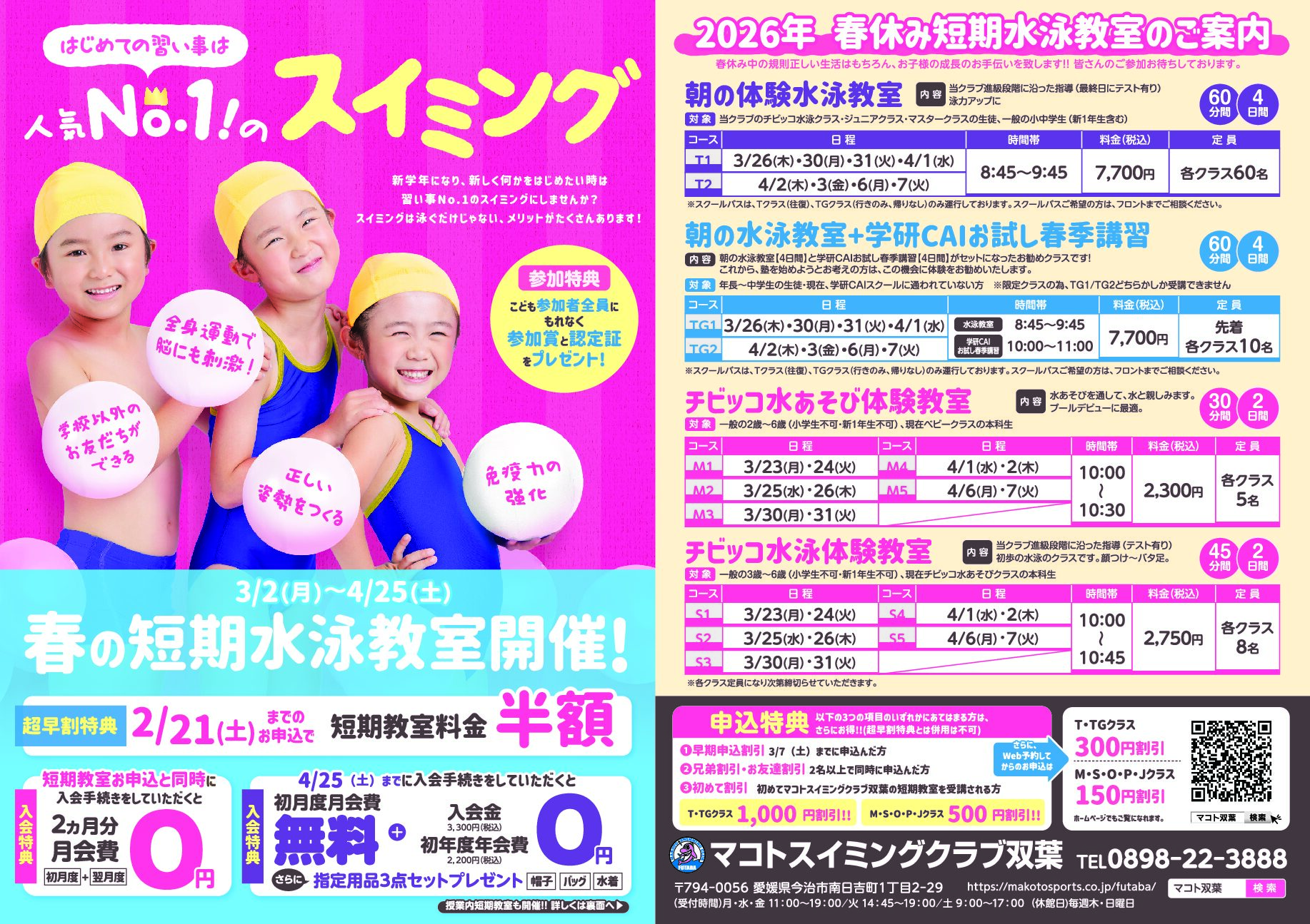 対象:幼児から小中学生 水慣れから、4泳法(クロール・背泳ぎ・バタフライ・平泳ぎ)を習得し、水泳の 基礎を身に付けます。