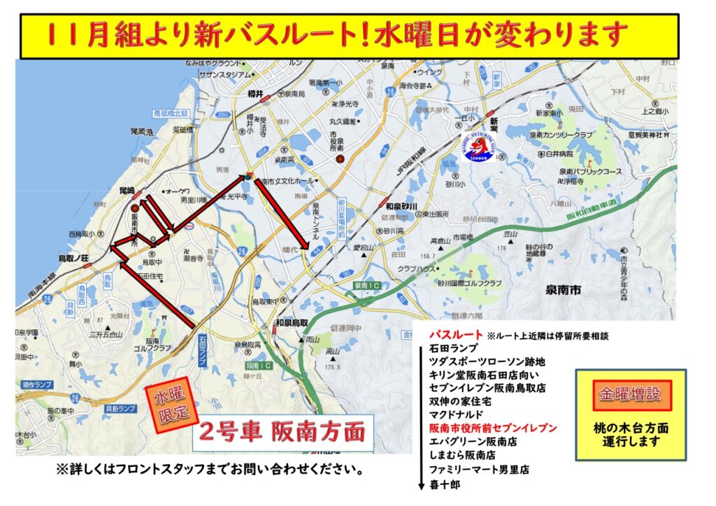 阪南方面のバスルートが増えます。阪南市役所前のセブンイレブンを通るルートを増設します。またルート上近隣にお住いの方は停留所要相談させていただきます。