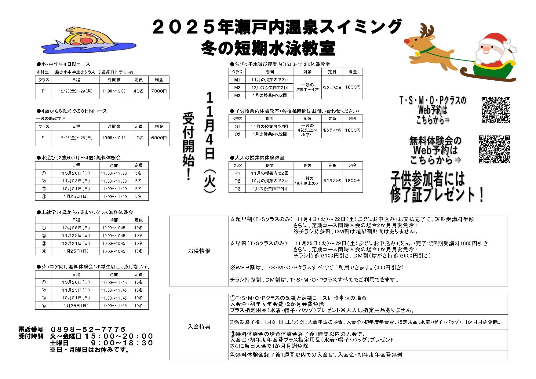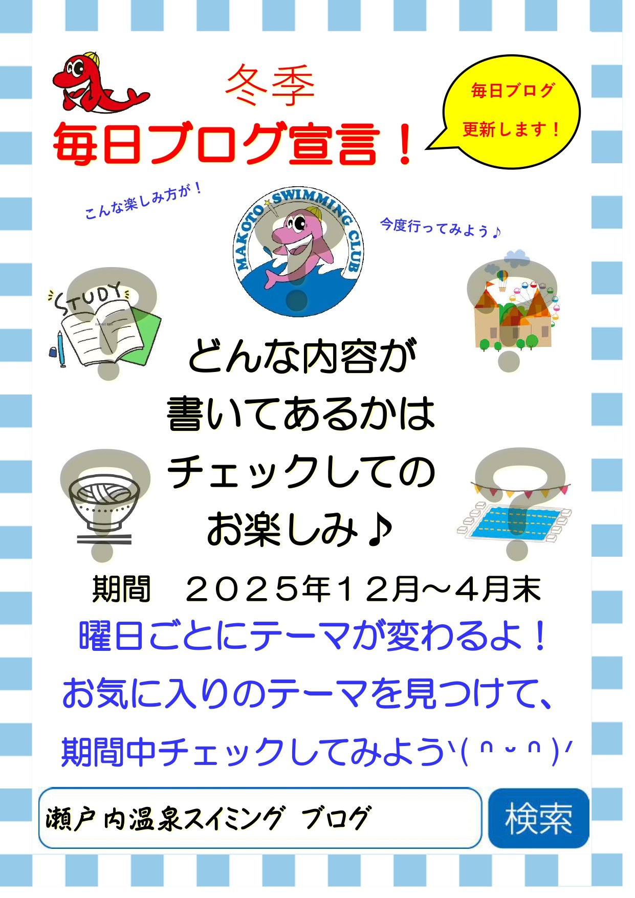 大きなプールで でっかい 大人になれ こども クラス 詳細はこちら ちびっこ水遊びクラス 対象:2歳6か月~ まずは遊びを通してプール、水に慣れることにチャレンジします。 ジュニアクラス 対象:4歳~ 水慣れから4泳法まで指導します。 マスタークラス 対象:4歳~ ジュニアクラスで習得した4泳法をさらに磨きます。